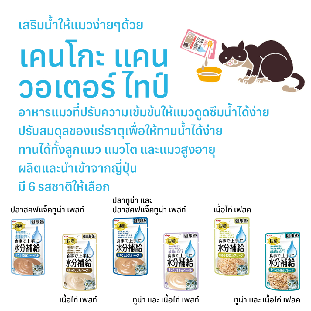 แมวเป็นสัตว์ที่มักดื่มน้ำน้อย ซึ่งอาจนำไปสู่ปัญหาสุขภาพ เช่น ภาวะขาดน้ำหรือโรคไต เคนโกะ แคน เพาซ์ วอเตอร์ ไทป์ ปลาสคิพแจ็คทูน่า เพสท์ ถูกออกแบบมาเพื่อช่วยเสริมความชุ่มชื้นให้แมวด้วย สมดุลแร่ธาตุที่ปรับแต่งมาอย่างเหมาะสม ทำให้ร่างกายดูดซึมน้ำและอิเล็กโทรไลต์ได้ดีขึ้น พร้อมทั้งปรับความเข้มข้นของสารอาหารให้ใกล้เคียงกับของเหลวในร่างกายแมว ช่วยลดภาระของไตและส่งเสริมสุขภาพที่ดีในระยะยาว