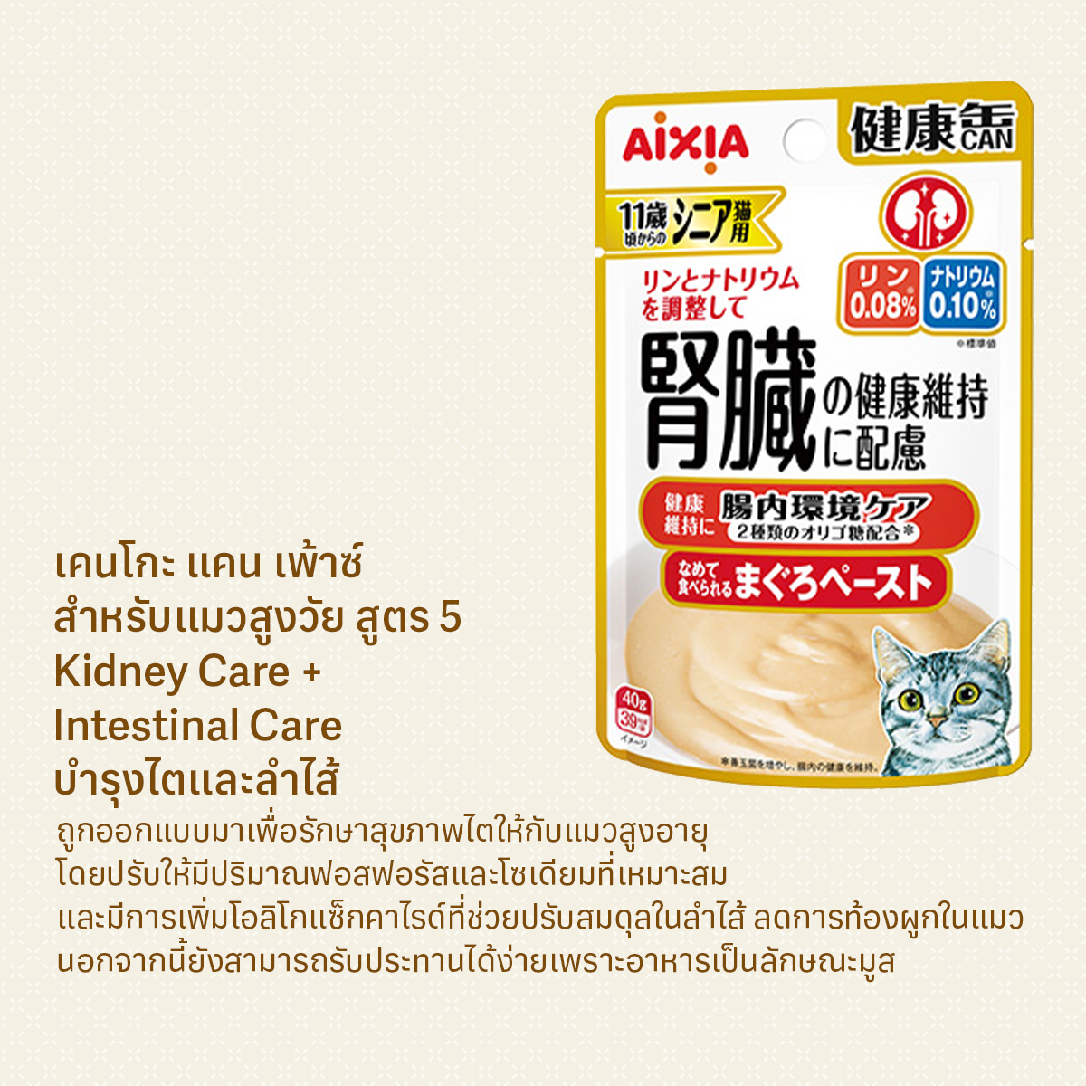 เมื่อแมวมีอายุมากขึ้น ระบบทางเดินอาหารและการย่อยอาหารอาจทำงานได้ไม่สมบูรณ์ เคนโกะ แคน เพ้าซ์ สำหรับแมวสูงวัย ปลาทูน่า สูตร5 ถูกออกแบบมาเพื่อช่วยดูแลสมดุลของระบบลำไส้ ด้วยการเสริม โอลิโกแซ็กคาไรด์ 2 ชนิด และ เส้นใยอาหาร ที่ช่วยปรับสมดุลจุลินทรีย์ในลำไส้ พร้อมทั้งช่วยให้ขับถ่ายเป็นปกติ อีกทั้งยังดูแลสุขภาพไตด้วยการปรับสมดุลของฟอสฟอรัสและโซเดียม อาหารสูตรนี้เป็นแบบเพสต์ที่นุ่ม ลื่น กลืนง่าย และเป็นอาหารเปียกที่ช่วยเพิ่มความชุ่มชื้นให้แมวสูงวัย